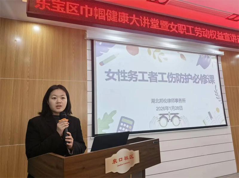 2026年1月28日上午,湖北邦伦律师事务所张炫莹律师走进泉口社区,积极参与由东宝区妇联、区人社局联合举办的“巾帼健康大讲堂暨女职工劳动权益宣讲”活动,为返乡务工及新就业形态女性带来了一堂扎实、实用的工伤维权普法课。